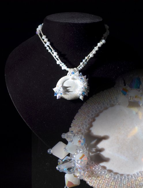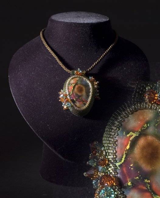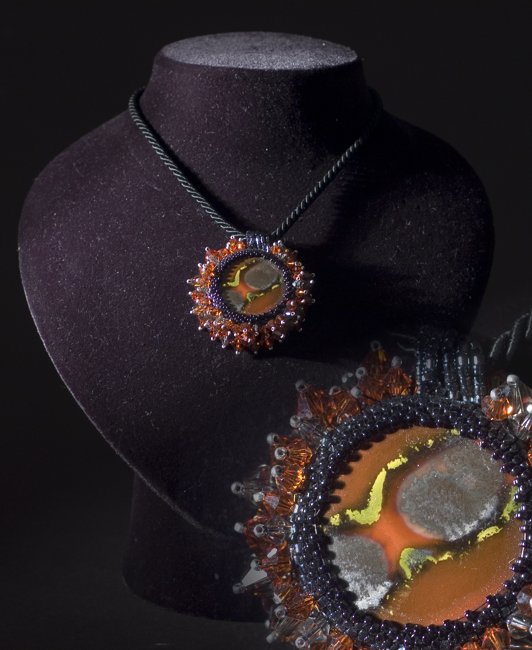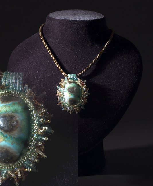 Our surfaces with their unique colors that are imprinted into cabochons, spheres, circles ... encountered materials such as crystals, pearls, silver, and velvet yarn .