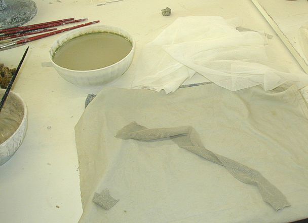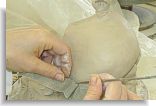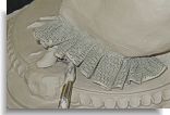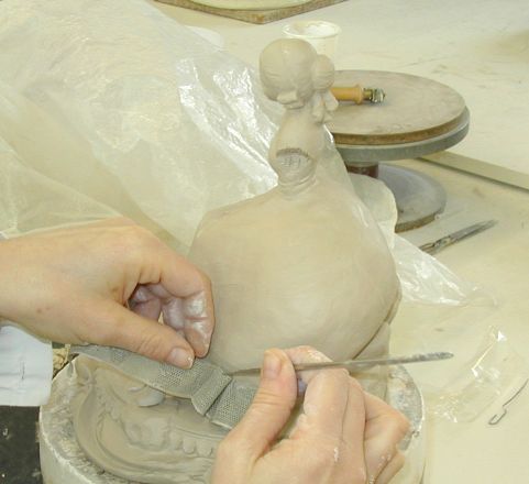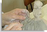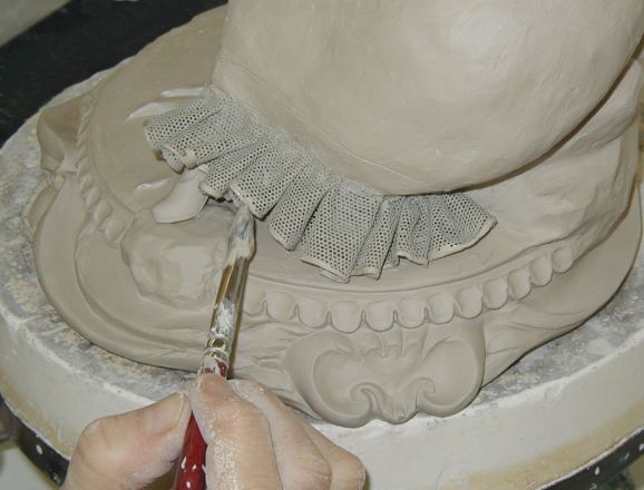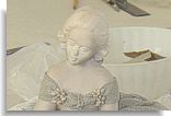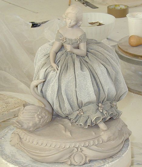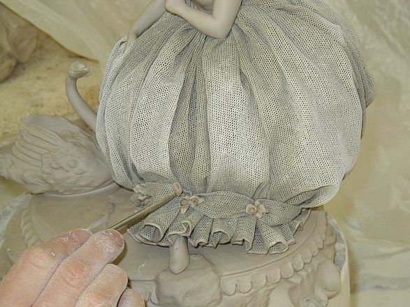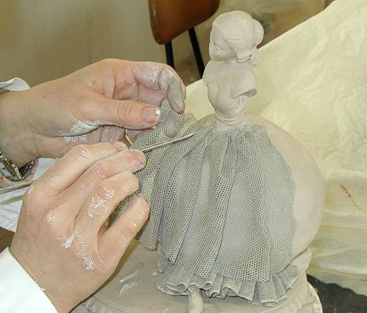 when it has reached the desired consistency is applied to the young lady in raw porcelain which had previously been molded into the casting, the operation is very delicate, because every fold must be shaped and firmly attached
